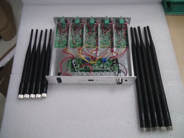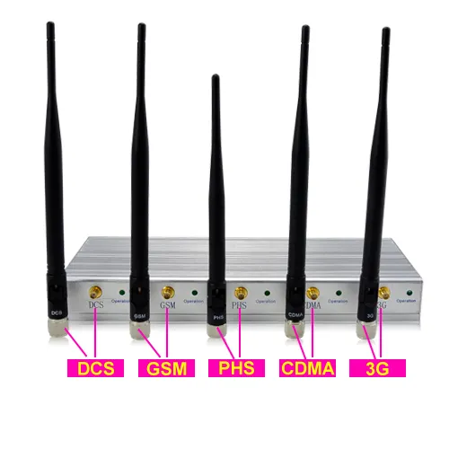 For absolute jamming of any cell phone signal, there is no stronger or more efficient solution than the 5 Antenna Cell Phone Jammer with Remote Control. This high quality device provides you with 10 Watts of output Power and 5 Powerful high gain antennas to completely block all mobile phone signals within 50 meters.